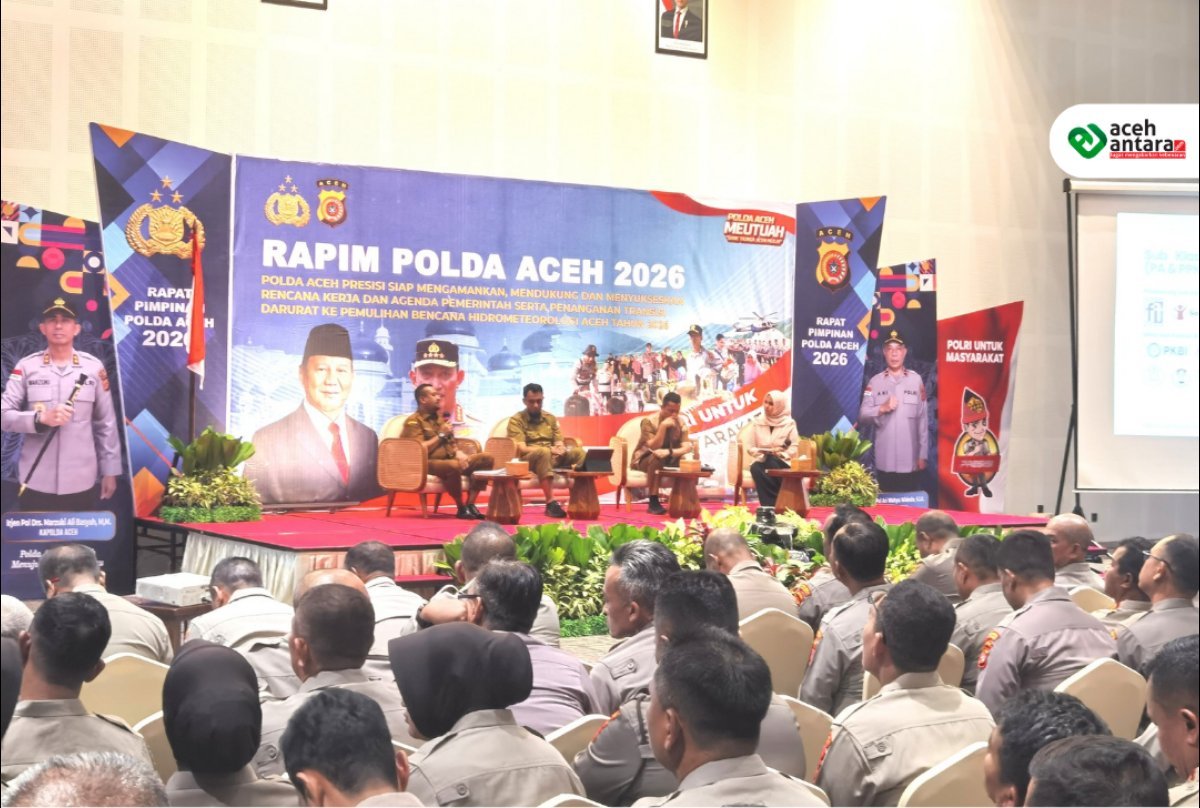 Polda Aceh Gelar Rapim 2026 dengan tema Polda Aceh presisi siap mengamankan, mendukung dan menyukseskan rencana kerja dan agenda Pemerintah serta penanganan transisi darurat ke pemulihan bencana hidrometeorologi Aceh Tahun 2026 di Ballroom The Pade Hotel, Banda Aceh, Selasa (24/2/2026).