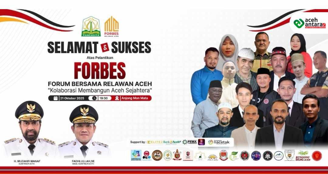 Acehantara.com | Banda Aceh – Forum Bersama (Forbes) Relawan Aceh akan resmi dikukuhkan pada Selasa malam, 21 Oktober 2025, pukul 20.00 WIB, di Anjong Mon Mata, Komplek Meuligoe Gubernur Aceh.