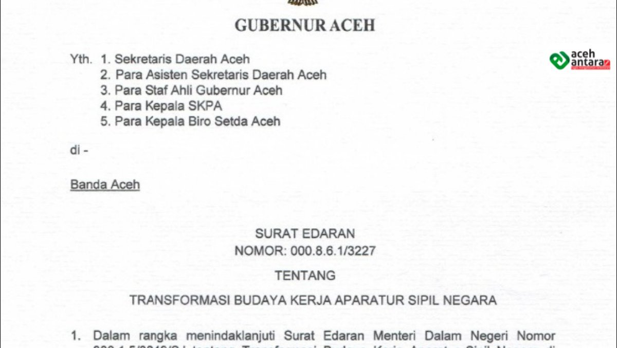 Kebijakan tersebut tertuang dalam Surat Edaran Gubernur Aceh Nomor 000.8.6.1/3227 tertanggal 2 April 2026 tentang Transformasi Budaya Kerja ASN di lingkungan Pemerintah Aceh.